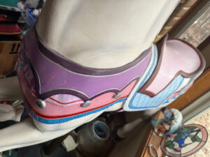 Handsome tucked head jumper with swirling blown mane. Layered trapping with jewels and tassels. Nice older restoration with roses painted on the saddle. Some seams showing but very solid horse. Horse hair tail. With brass and stand.