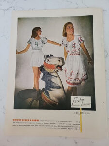 Outside Row from the Feltman period at Illions (1910-1915). Handsome raised head with deeply cared blown mane. Elaborate jeweled headstall, chest straps and hinds straps. Bedroll at cantle. One ear tip and three lower legs and hooves (8 inches) re-carved. In older paint. For fun, this horse was featured in a 1947 Women’s Ameritex Freshy Playclothes Vintage Carnival Carousel horse ad.