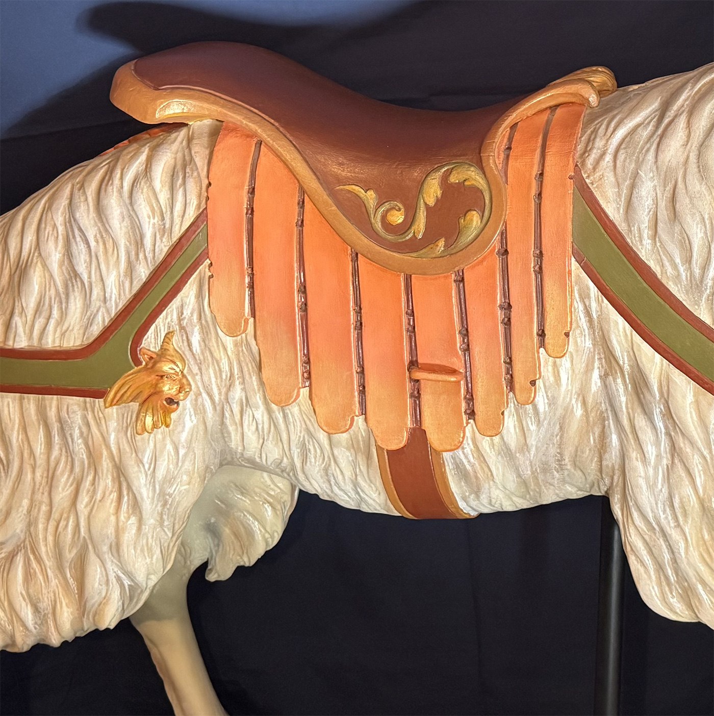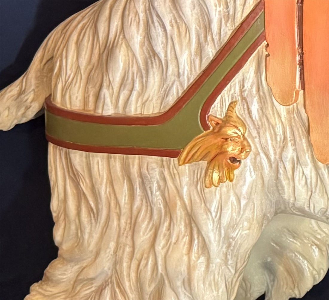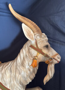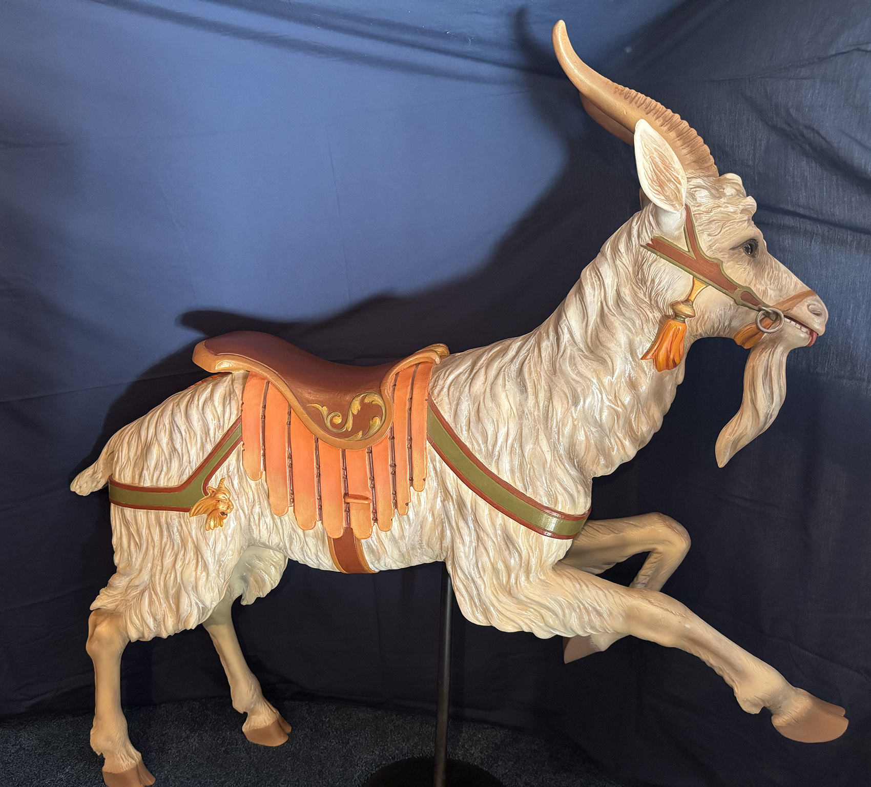Large goat. From the carousel that last operated at Ontelaunee Park, Tripoli, PA. Deeply carved fur, large tassel at the headstall, carved mystical griffin-type head on the blanket, shell saddle pommel. Nice older restoration.
